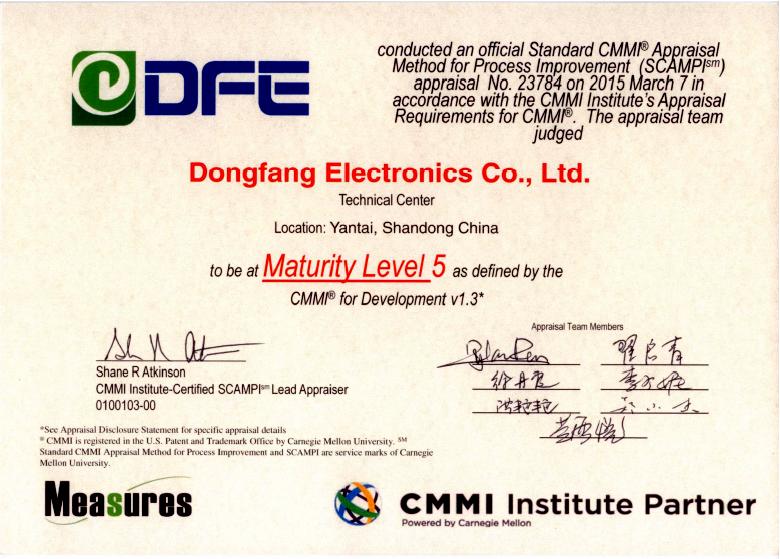 This model is divided into five levels. Dongfang Electronics Co., Ltd passed CMMI Level 3 Assessment the first time in 2008, and passed CMMI Level 3 Re-assessment in 2011. On March 7th 2015, DFE passed CMMI Level 5, the highest level for software maturity, which means that R&D and products of Dongfang Electronics Co., Ltd have the ability for quantization-based prediction, analysis, control and continuous improvement.